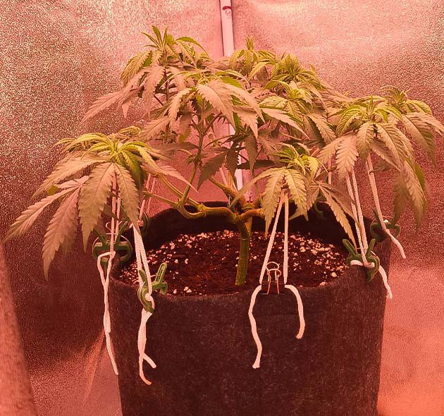 В самом начале седьмой недели продолжились тренировки растения. На фото синие черточки – это места изломов, подломов, подгибов. В общем, провели суперкроппинг растения, дабы в дальнейшем иметь дополнительное питательное колено и более плотные стволы. К концу недели все места изломов и повреждений растения успешно зажили. После снятия жгутов и резинок мы заново натянули растение с использованием хозяйственной веревки, что оказалось значительно удобнее для работы с горшками Propot. Текущее натяжение временное, будем корректировать его по мере роста растения. Провели дефолиацию, удалили крупные листья и обработали растение трихомайзером по листве второй раз.