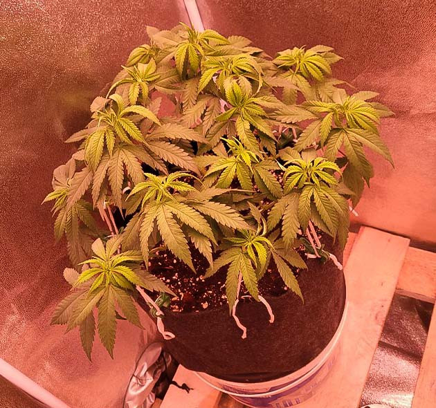 Вертикальный рост растения прекратился, сигнализируя о наступлении фосфорного окна. Теперь мы переходим к интенсивному внесению удобрений для цветения. Permanent Marker развил характерный резкий аромат, напоминающий запах фломастера. На фото – крайний левый куст.