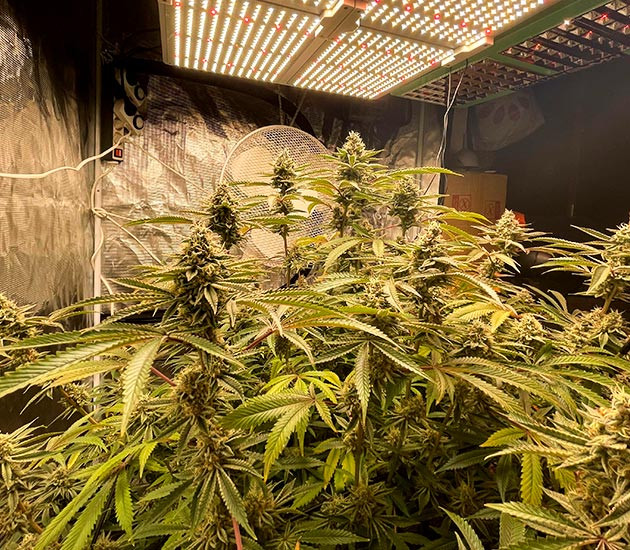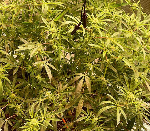 Куст – настоящий монстр! Он занял практически всё пространство палатки, а это, я напомню, квадрат 120 × 120. Поставил сверху еще одну сетку ScrOG и развёл основные колы в ячейки, чтобы они росли обособленно друг от друга. Некоторые выглядят очень внушительно, крупные соцветия срастаются в одну сплошную мегашишку. На листьях много «сахара», но маленькие макушечные листики начинает немного гнуть. Полив, условия, подкормка – все без изменений. Куст стабильно выпивает 2 литра за сутки, жажды не демонстрирует, перелива тоже.