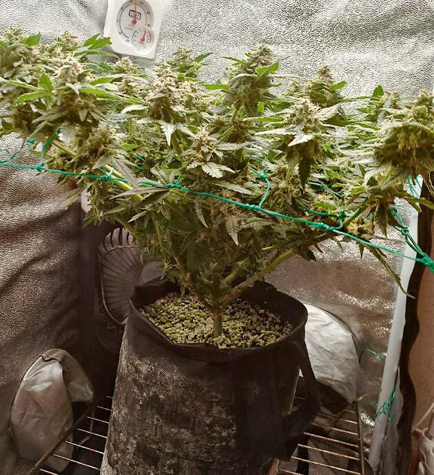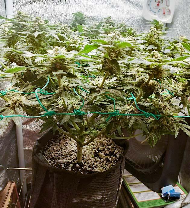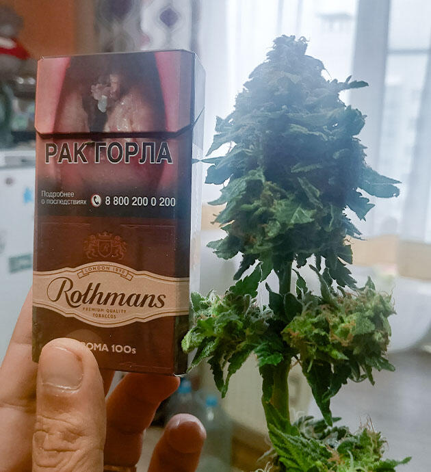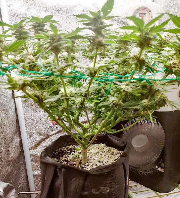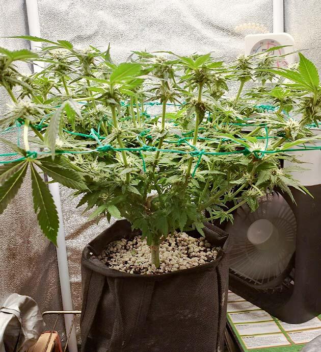 Кустик занял практически все места в сетке, но продолжает расти, а я продолжаю его бережно заплетать. Сейчас появился уже довольно сильный запах классической марихуаны, который ни с чем не спутаешь. Стараюсь поливать с открытой дверцей быстрее, чтобы не привлекать внимание кота или, не дай бог, соседей. Поэтому без фильтра поднимать этот сорт не рекомендую точно.