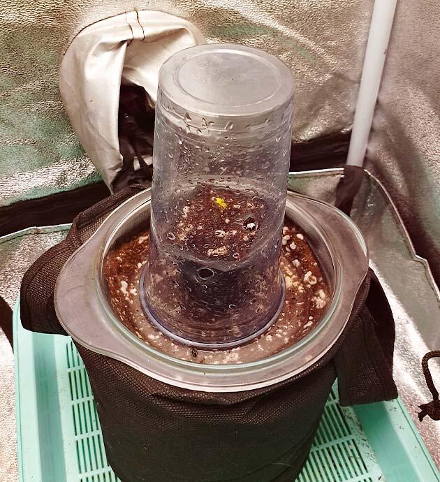 Первые 5 дней росток был в контейнере от микрозелени, чтобы не проливать до дренажа весь пятилитровый мешок. И вдобавок если сразу сажать в горшок, то саженец будет тянуться, и насыпать ему холмы ну как-то не айс.