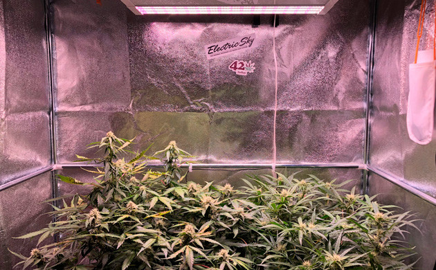 Для начала об условиях культивирования. Я выращиваю каннабис в компактном гроубоксе Secret Jardin 120 W. После некоторых проблем с освещением приобрел светодиодный светильник Electric Sky 180 V2 от The Green Sunshine Company мощностью в 180 Ватт и сейчас уверен в нем на сто процентов. Для такой площади этого света предостаточно. В качестве субстрата использую кокосовое волокно и высаживаю растения в специальные горшки AIR-POT. Удобрения использую от компании General Hydroponics.