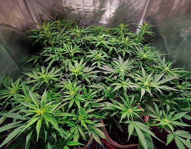 Итак, 7-я неделя, начинаю отсчет цветения, так как вега точно закончилась, судя по всем визуальным признакам. Две большие растишки около 30 сантиметров в высоту, две другие меньше, но в целом выглядят ок. Несмотря на свой небольшой опыт, я сразу отметил разницу структуры кустов Sour Diesel Auto и Northern Lights, которые я гровил в прошлый раз. В целом рассказывать больше особо не о чем, показатели в гроубоксе на автоконтроллере, держатся стабильно в заданных диапазонах, температура 24-25 °C, влажность 55-60 %, вентиляция и обдув работают в режиме 30/30. Поливал по 1 литру, схему удобрений не менял, по 3 мл каждого компонента.