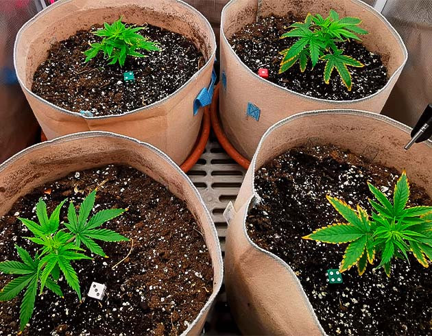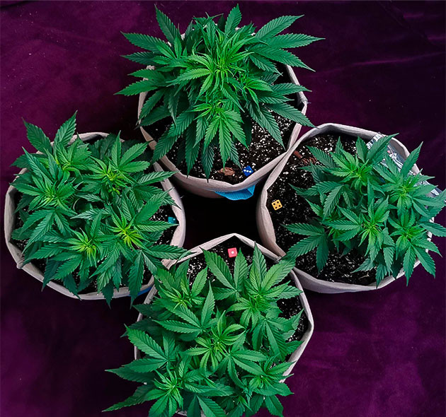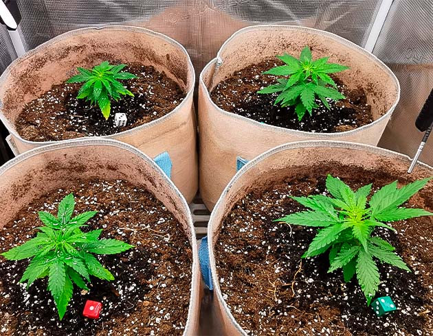 В начале третьей недели настала пора пересадить кустики. Они переехали в мешки по 15 литров, и, таким образом, весь мой гроубокс был заполнен. Корни покрыли весь земляной ком у каждого из растений, пересадка прошла без особых проблем. Кустики освоились на новом месте быстро, уже через двое суток получили по 250 мл воды с удобрениями: