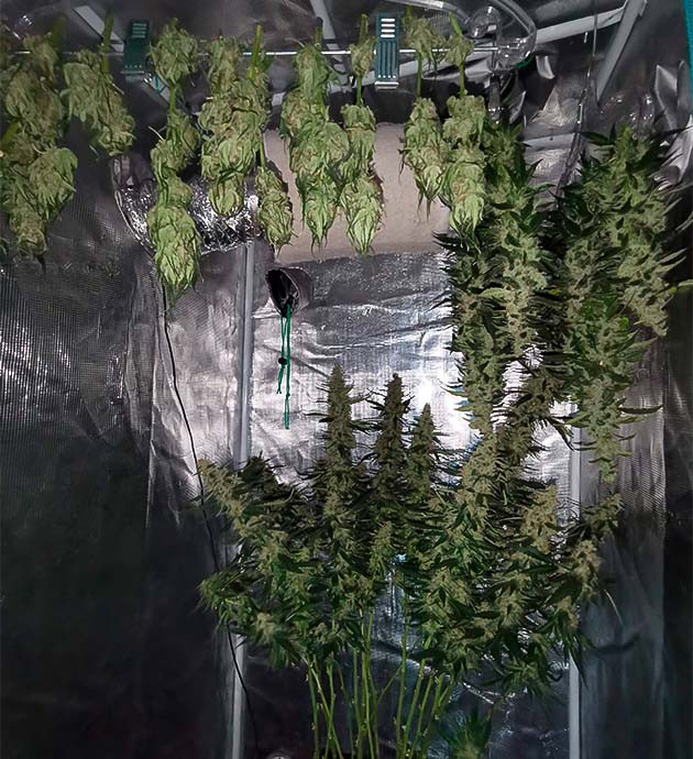На 12-й неделе я срубил сначала один куст, затем через пару дней большой. Один куст дал около 200 грамм урожая в мокром виде, второй – чуть немного меньше. Разделил кусты на колы и развесил сушиться в отдельной комнате. Но самое интересное еще впереди, два оставшихся растения гораздо больше. Они подходят к финальной стадии развития, раздумываю над тем, как быть оставшиеся неделю-две. А пока база + Big Bud в прежнем количестве.