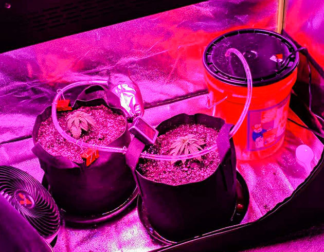 В начале третьей недели я пересадил подросшие кустики в двадцатилитровые гроубэги, и им предстояло целую неделю стоять без моего присмотра. Вернее, было так. Я отправился в отпуск, но перед этим соорудил систему автополива. Я смастерил такую конструкцию: большое ведро + трубки к каждому горшку + помпа, подключенная к умной розетке, которой я могу управлять с телефона через приложение. В боксе поставил веб-камеру, которая была направлена на растишки.