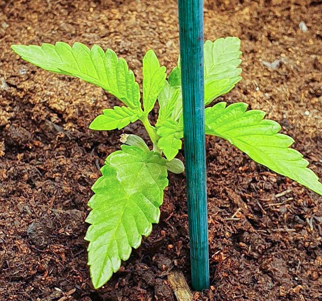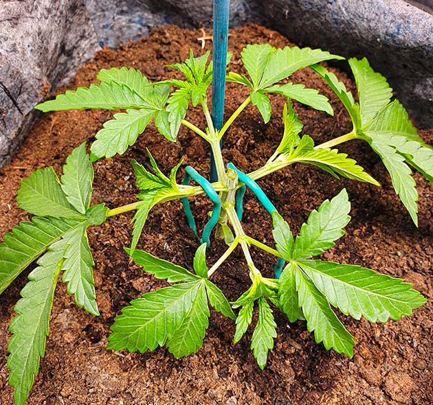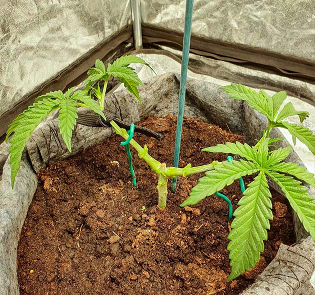 Забегая наперед скажу, что растишке предстоит серьезный тренировочный процесс, а вот кормить саженец на веге я не буду. В Biobizz All Mix достаточно питательных веществ на период вегетации. В конце третьей недели, а именно на 20-й день от каски, я сделал первый топпинг и разогнул ветви, готовя кустик к технике мейнлининг. Девочка чувствует себя отлично.