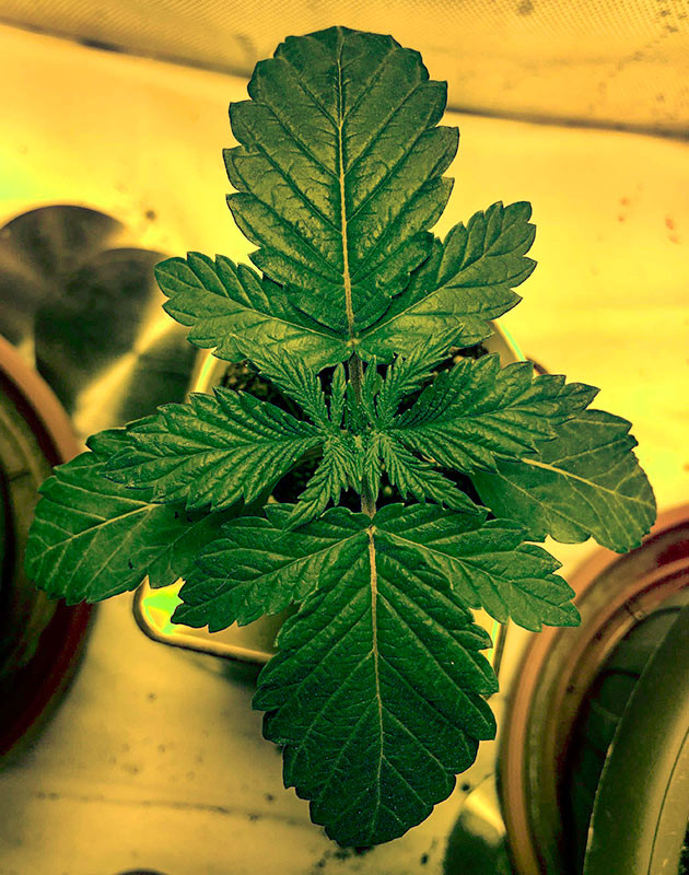 С первых же дней жизни Wedding Gelato показал себя с лучшей стороны. Он стремительно развивался, показывая мне один за другим этажи новых листьев. Буквально через день мне уже пришлось снять пленку, так как росток уперся в нее верхушкой, а к концу первой недели у каннабиса уже было три пары ярко-зеленых листьев, и уже начиналась закладка четвертой пары.