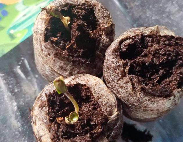 Проращиваю по стандартной схеме, используя торфяные таблетки. Перед этим на сутки или около того оставляю семена откисать в небольшой емкости с водой и тремя каплями перекиси. Две проросли на второй день, еще одна на третий.