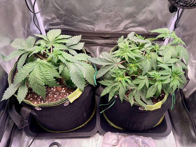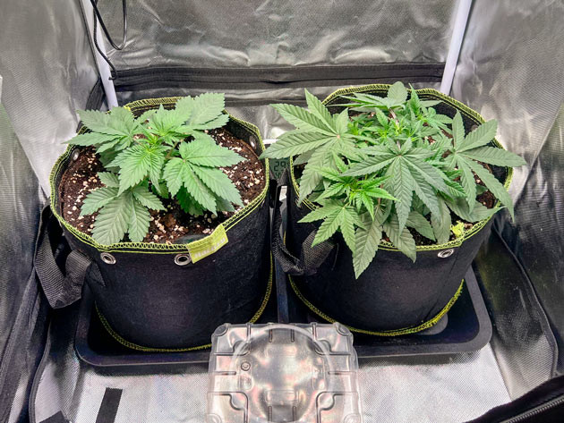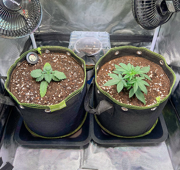 Проращивание прошло успешно. За первую неделю ростки успели сформировать несколько пар листьев. Я разместил источник света в 40 сантиметрах от них, а также решил придерживаться светового режима 16/8. На второй неделе я успешно произвел пересадку в тканевые горшки на 23 литра.