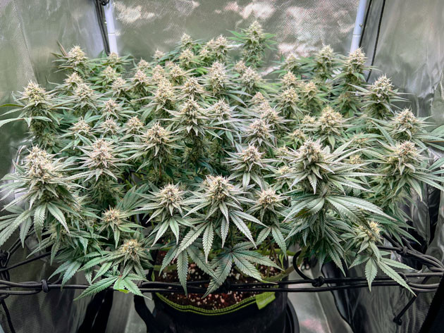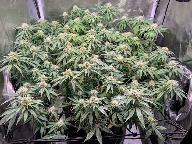 За три недели куст сильно вытянулся и увеличился в размерах. Соцветия уже вовсю благоухают приятным травянистым ароматом. Я удалил всю ненужную листву, тем самым улучшив распределение света. Для полива я использую 1,5 литра воды в сутки и считаю это оптимальным объемом для такого крупного растения.