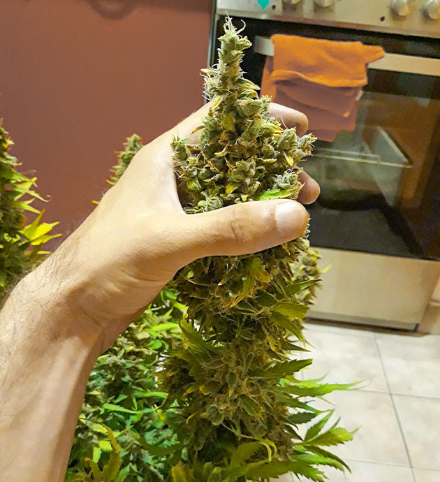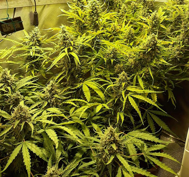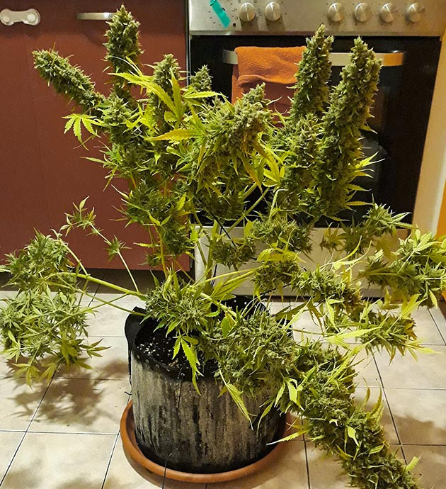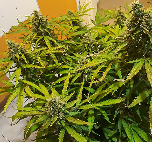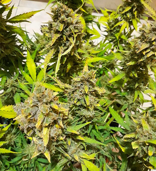 На 12-й неделе ветки перестали справляться с весом соцветий, некоторые не просто гнулись, а буквально надламывались. Поэтому было принято решение собирать урожай в середине недели, подержав сутки в темноте. Очистил их от лишней листвы и развесил сушиться в палатке, не срезая ветви, как есть, головой вниз.
