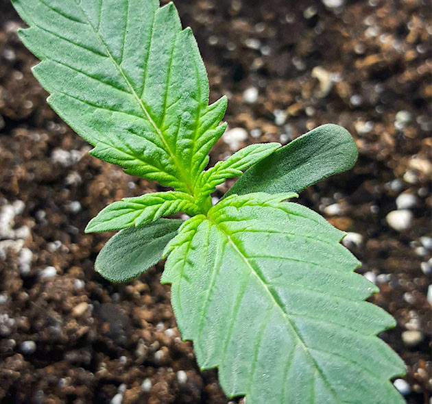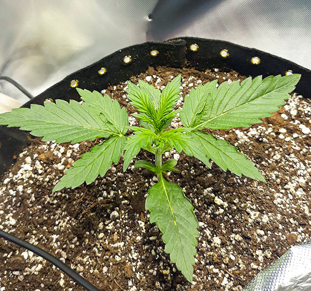 На восьмой день от прорастания я поменял свет в тенте. Повесил лампу ДНаТ на 250 Вт на расстоянии 50 сантиметров от саженцев. Ниже вешать боюсь, так как не хочу сжечь растения. В этот же день полил по 250 мл воды с Rhizotonic и Cannazym по 1 мл. Спустя сутки проверил показатели в тенте. Температура на уровне 25,4 °C, влажность 54 %. Контрольные замеры на протяжении всей последующей недели меня значительно успокоили. Температура не поднималась выше 28 °C, а влажность не опускалась ниже 50 %. На 10-й день полил по 250 мл чистой воды. На 12-й решил дать растишкам по 1,5 л компота с 3 мл Rhizotonic и 4 мл Cannazym, так как почва была полностью сухой. На следующий день заметил на одном из кустиков мутацию. На третьем узле четырехпалый листик, а с другой стороны пятипалый, но с очень странным центральным сегментом. Теперь я зову эту растишку Франкенштейн, или Френк. К концу второй недели он уже показал пол, и это была девочка, но всё равно осталась Френком. К сожалению, помимо определения пола, я также обнаружил несколько грибных комариков. Было принято решение хорошо просушить почву, так как они откладывают яйца только во влажный грунт.