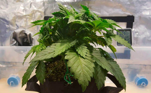 На 31-й день от семки пересадил куст в больший горшок объёмом 20 литров. Субстрат тот же – кокос и перлит. После пересадки удалил большое количество веерных листьев, чтобы энергия растихи шла на восстановление после пересадки. Условия в тенте следующие: