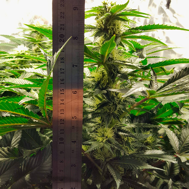 Растиха не перестаёт вытягиваться, набрала еще 10 сантиметров. До ламп осталось всего 27-30 сантиметров. Таким образом, ее рост достиг отметки в 85 сантиметров. Перестал тренировать растение, но удалил почти все лишние листья и некоторые небольшие веточки, чтобы улучшить циркуляцию воздуха во всех частях куста. Забыл упомянуть, что световой режим с начала цветения выставлен на 12/12. Температура днем достигает 30 °C, ночью опускается до 21 °C. Влажность в районе 40%.