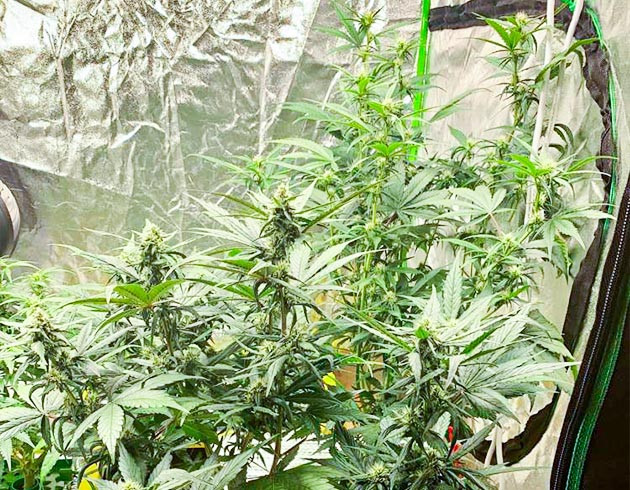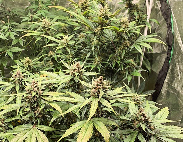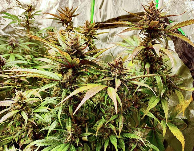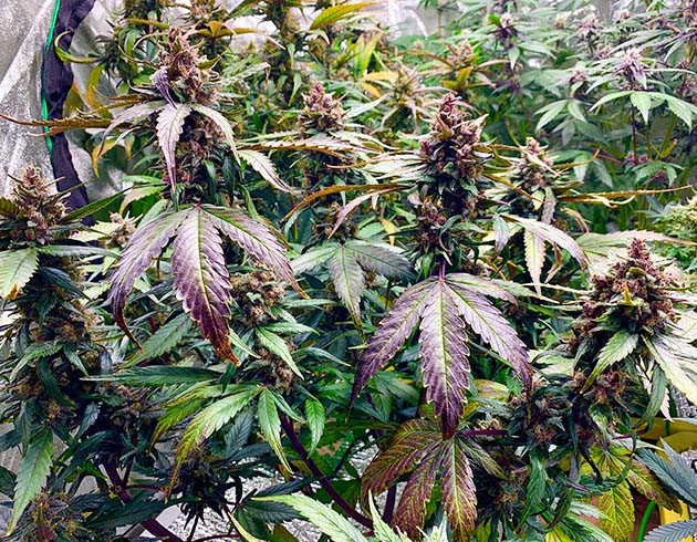 Последние две недели развития кустов. Я получил прекрасный фиолетовый фенотип с крупными смолистыми шишками, а вторая растишка выглядела классически в привычном понимании конопли. Не буду таить, я очень доволен тем, что получил два разных фенотипа, и не буду говорить о нестабильности сорта или проблемах с генетикой. Вопросов по качеству самого куста, его здоровью и темпам его развития нет. Также и со вторым кустом. Несмотря на то, что он тянулся дольше, никаких нареканий у меня нет. Девятая и десятая недели прошли под флагом набора массы шишек. Я постепенно удалял лишнюю листву, следил за состоянием трихом и ждал момента, когда количество янтарных трихом будет составлять около 30 %, а прозрачных не останется совсем. Такой момент наступил в начале 11-й недели. Оставить кусты в темноте или промыть у меня не было возможности, так как другой сорт в палатке еще не созрел. Поэтому было принято волевое решение рубить урожай без дополнительных манипуляций.