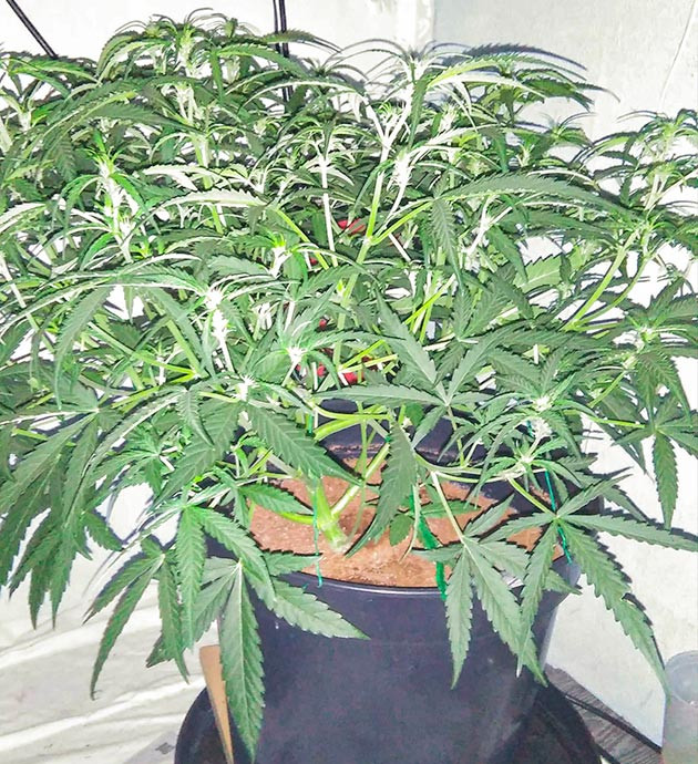 А вот на 11-й неделе соцветия стали стремительно набухать. Тут и там появились оранжевые волоски, трихомы стали быстро мутнеть, колы покрываться смолой и сахаром. Длинные ветви начали гнуться, поэтому аккуратно подвязал их к центральному стеблю. На предыдущей неделе была последняя серьезная подкормка, теперь постепенно готовлю кустик к харвесту. Он получил еще одну порцию компота с терпинатором и SHOGUN Dragon Force.
