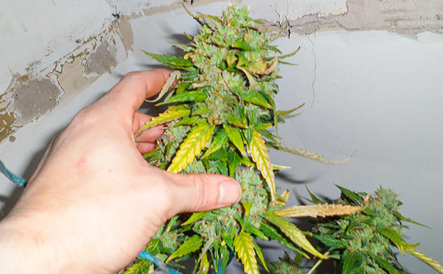 На 12-й неделе почти все трихомы налились молоком, стеклянных не осталось совсем. Так как янтаря еще не наблюдалось, решил еще раз полить раствором с терпинатором и только потом начинать промывку. С конца 12-й недели лил по 5 литров воды через день. Всего пролил 25 литров, после чего оставил куст на сутки в темноте. К этому моменту соцветия отлично набухли, стали не просто большими, но еще плотными и смолистыми. Очень много смолы как на самих цветах, так и на листве. Срубил куст на 90-й день от прорастания семени.