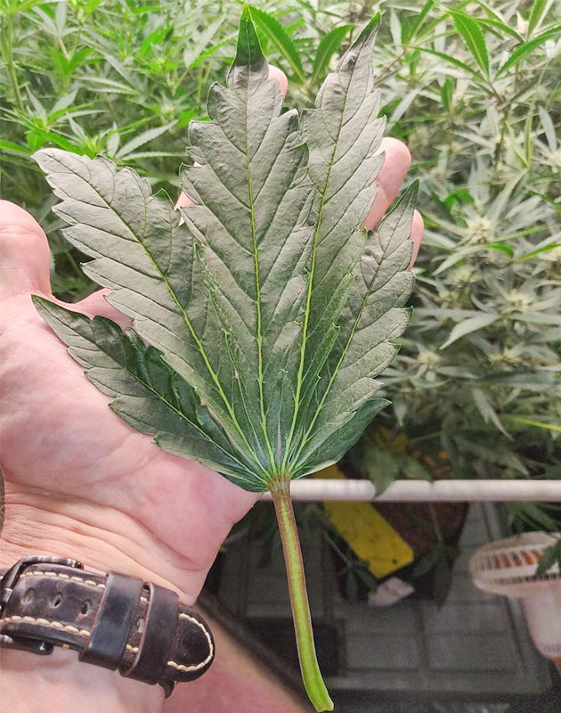 На восьмой неделе кустик вырос еще на 30 сантиметров. К концу недели его рост составлял 90 сантиметров. Он явно наверстывает то, что упустил на первых порах своей жизни. А вот странная генетика и форма листьев не перестают меня удивлять. Вы только взгляните на них. Самая настоящая гусиная лапка! ? На макушках начали завязываться соцветия, да и в целом кол получилось довольно много, несмотря на странный, исключительно вертикальный рост куста. Изменений в условиях микроклимата и составе компота нет.