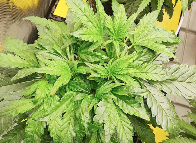 На шестой неделе я заметил одну особенность кустика: он растет исключительно вверх, практически не разрастаясь горизонтально. Попробовал немного разогнуть ветви, но пришел к выводу, что уже поздно и в этом нет особого смысла. А еще его листья выглядят действительно странно. Обидно, что я не могу с уверенностью сказать, связано ли это с повреждением при проращивании либо же особенность генетики сорта. Высота растишки 40 сантиметров, и она вот-вот зацветет. Условия в гроубоксе следующие:
