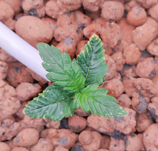 Вторая неделя особого оптимизма не вселяет. Из-за повреждения Strawberry Gorilla Auto отстает очень сильно, что хорошо видно на фото. Кроме замедленного роста, наблюдается и пигментация на листьях. Но ставка была сделана на крепкую генетику сорта, поэтому я не стал паниковать и замачивать новую семечку. На второй неделе условия в палатке остались без изменений, а вот раствор в баке для полива изменился, ppm повышен до 600, изменены состав и пропорции:
