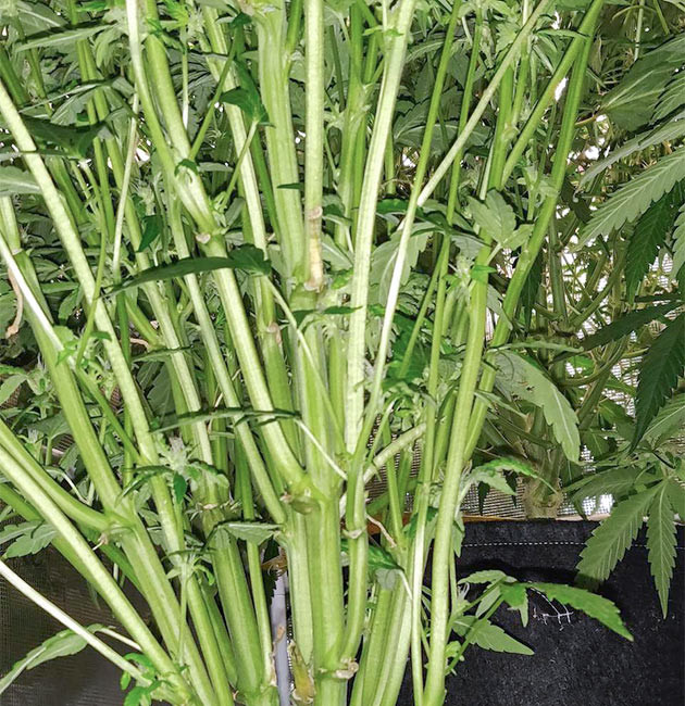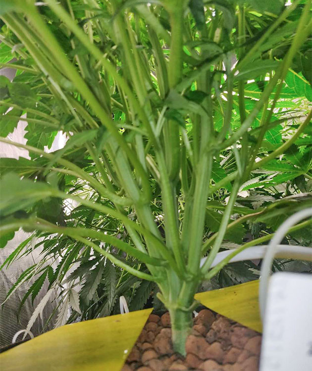На седьмой неделе девочка сильно прибавила в росте. Она вытянулась примерно на 20 сантиметров и все так же отказывается расти в ширину. Удалил очень много листвы. Кустик выглядит странно, но никаких проблем с ним нет. Он практически сравнялся с остальными растениями в боксе. Единственное неудобство из-за густой структуры куста. Приходится периодически «распутывать» ветви и листья. Условия в гроубоксе без изменений, раствор такой же, как на прошлой неделе.