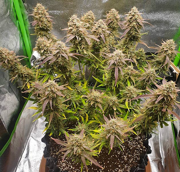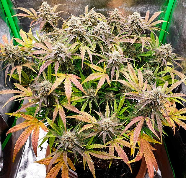 В первый день 10-й недели провел дефолиацию и убрал все листья с верхней трети куста, чтобы в последнюю неделю бутоны имели достаточное освещение по всей поверхности. Фиолетовые оттенки становятся все ярче. Потрясающе!