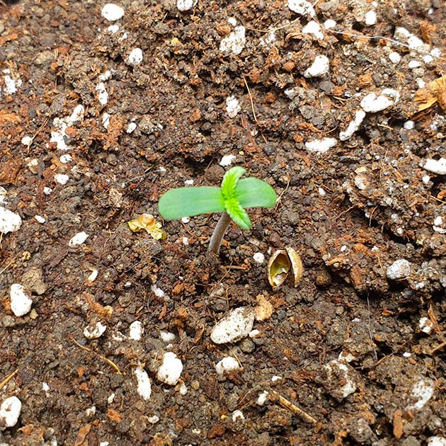 После прорастания росток начал сильно вытягиваться вверх, так что на третий день мне пришлось даже досыпать около 2 см почвы, чтобы обеспечить большую устойчивость и добиться лучшего роста корней. На поверхность насыпал еще немного микоризы и триходермы.