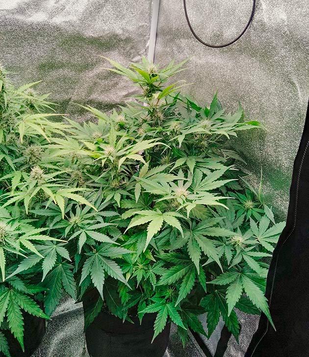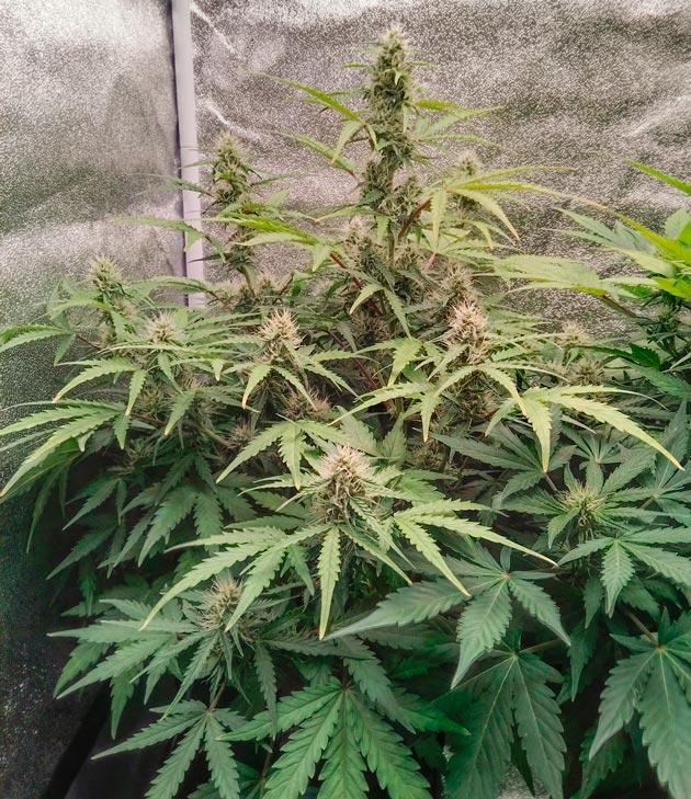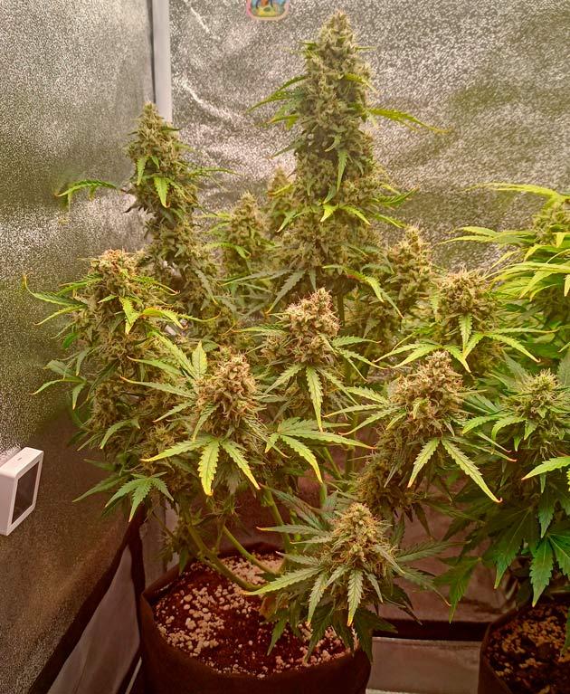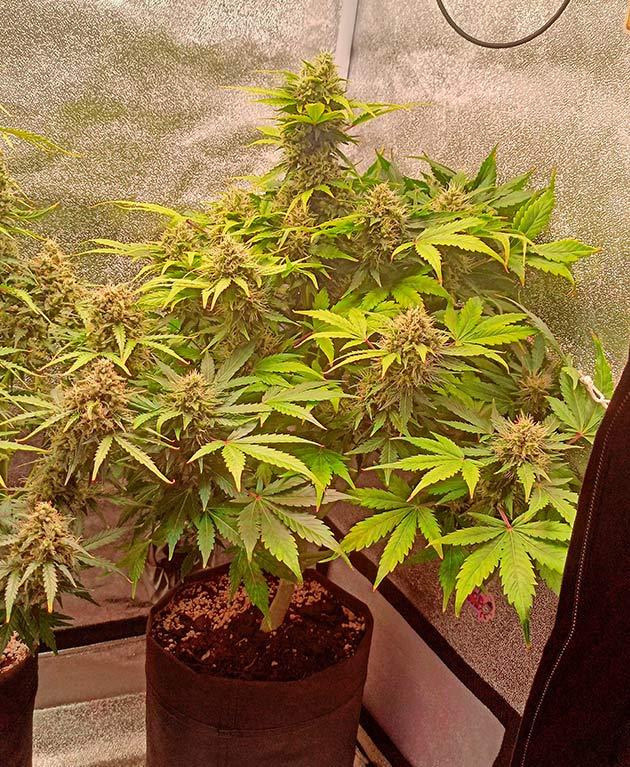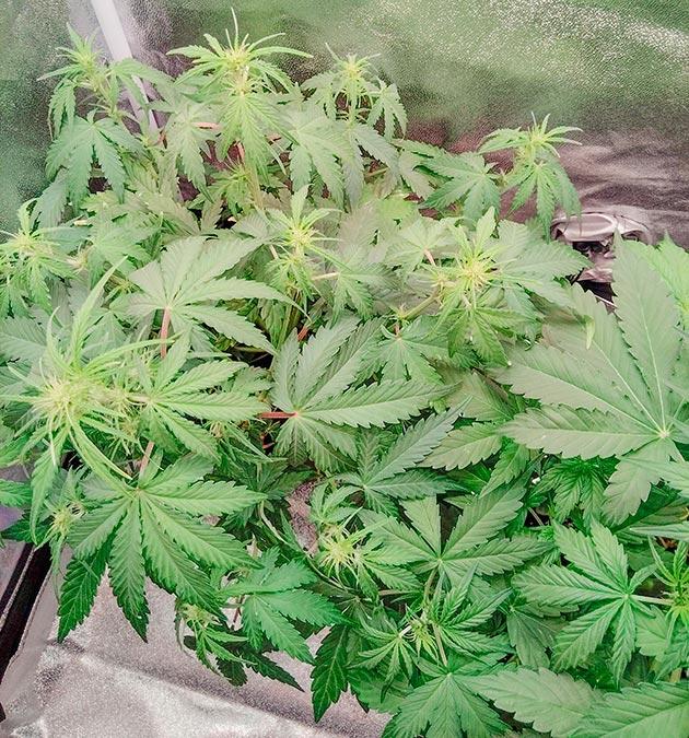 Кустик приятно выглядит, как будто осень началась. Большая часть листьев вверху желтеет, где-то краснеют, внизу зеленые. Еще недельку подержу, пару раз Bloom и чистой водой пролью и под нож. Выглядит неплохо, бошки жирненькие, получше «Флориды» на вид. Были бы досветы еще, вниз кинуть их, чтобы нижние колы тоже свет ловили, и вообще супер. Наверное, докуплю на следующий раз.