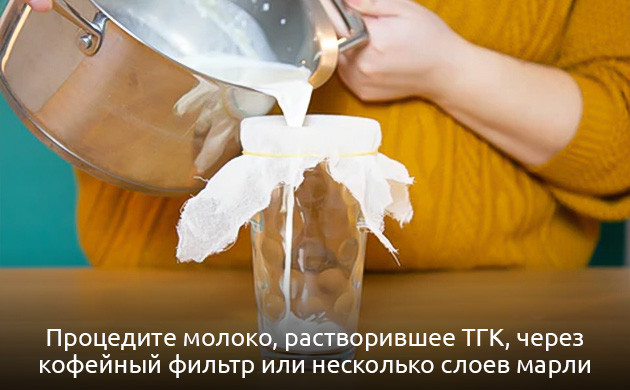 Процедите молоко, растворившее ТГК, через кофейный фильтр или несколько слоев марли в отдельную емкость.