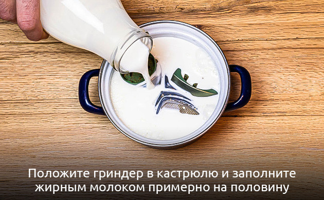 Сначала соберите все необходимое: гриндер, пару кастрюлек разного диаметра для сооружения водяной бани, а также ситечко и молоко. Для чистки лучше всего подходит жирное коровье молоко.