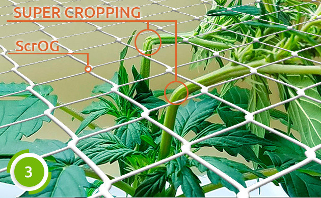 - Третий этап. После восстановления от стресса, примерно через неделю можно выполнить суперкроппинг, чтобы сделать ветви более крепкими и выносливыми для удержания крупных бутонов в будущем, а также натянуть сетку или проволоку над кроной, чтобы помочь ветвям. Если вы в будущем планируете перемещать горшок с каннабисом, то сети ScrOG лучше избегать, ведь после ее монтажа транспортировка не представляется возможной.
