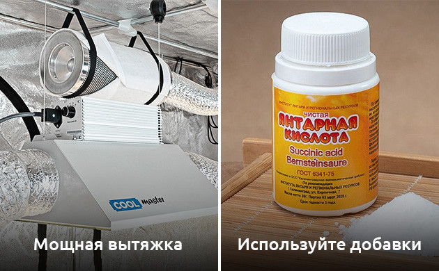 Тепловой стресс приводит к замедлению темпов роста и повреждению растительных тканей. Ускорить процесс восстановления каннабиса после такого шока помогут некоторые добавки вроде экстракта морских водорослей или янтарной кислоты. Только учтите, эффективными любые противострессовые препараты будут лишь тогда, когда ситуация с повышенной температурой будет решена.