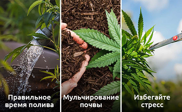 Растения, наполненные влагой, намного легче переносят высокие значения температур, чем те, которые страдают от жажды. Следует особенно ответственно относиться к поливу растений в жаркие дни. Поливать коноплю лучше на рассвете или уже после захода солнца, чтобы влага испарялась постепенно, а на поверхности грунта не образовывалась плотная корка.