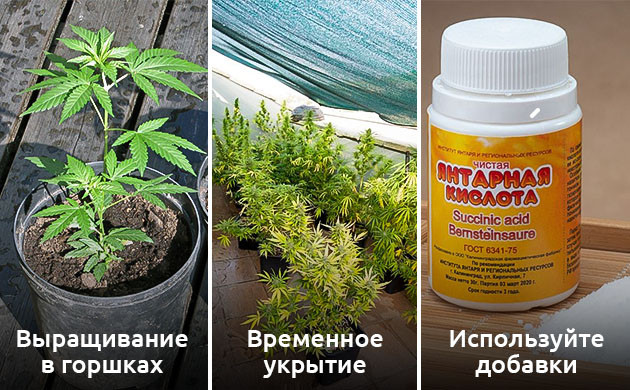 Чтобы листья каннабиса не горели под обжигающими лучами полуденного солнца в разгар лета, плантацию можно накрывать брезентом или затеняющей сеткой, которая продается в специализированных магазинах для садоводов. Если плотный тент нужно будет убирать после пика жары, чтобы растения получали достаточно прямого света для фотосинтеза, то сетка может оставаться над растениями весь жаркий сезон. Она частично пропускает солнечные лучи и создает комфортную полутень для стабильного роста конопли.