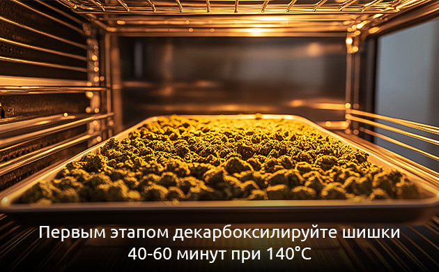 - Первым этапом в приготовлении любого съестного лакомства с марихуаной всегда является декарбоксилирование растительной массы. Сложное слово может испугать кулинара-новичка, но на самом деле декарбоксилирование – это просто медленное прогревание измельченных шишек в духовке при температуре 140 градусов. Занимает этот процесс обычно 40-60 минут (в зависимости от объема стаффа), а подробное объяснение, зачем вообще нужна такая термическая обработка конопли, можно найти на официальном форуме «Семяныча».