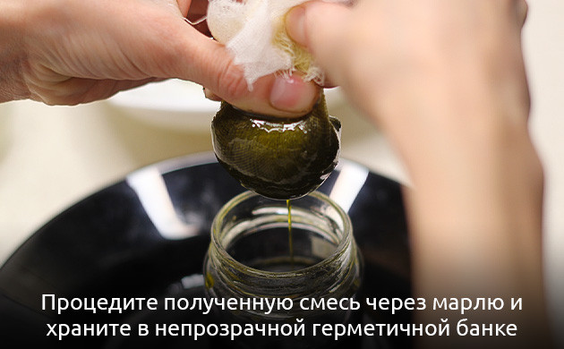 - Процедите полученную смесь через марлю и храните в непрозрачной герметичной банке в тёмном прохладном месте.