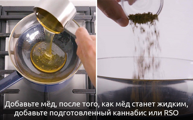 - Поле того, как мёд станет жидким, добавьте подготовленный каннабис или RSO;