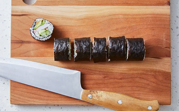 - После того как все роллы приготовлены, острым ножом нарежьте их на дольки толщиной 2-3 сантиметра.