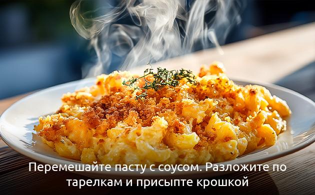 Хрустящая запечённая корочка? Легко! Если хочется больше запечённой текстуры, то выложите готовые мак-н-чиз в жаропрочную форму, посыпьте крошкой и поставьте под гриль (или в духовку на режим верхнего жара) на 3-5 минут. Следите, чтобы крошка не подгорела, достаточно лёгкого золотистого цвета и хруста.