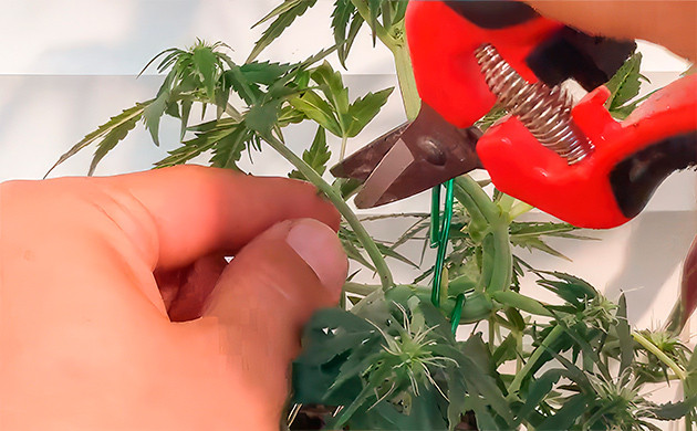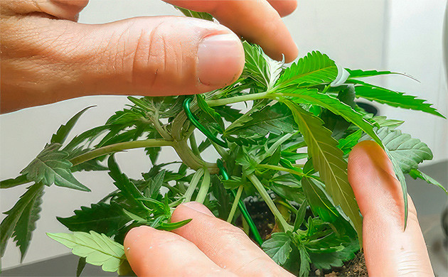 Работы по формированию кроны следует начинать сразу же после того, как черенок укоренится в своем новом горшке. На первом этапе необходимо подрезать кончик основного стебля. После того как вторая пара побегов догонит макушку, с ними нужно произвести аналогичную операцию. Таким образом нужно нарастить три яруса. Когда основа готова, можно приступать к изгибанию стебля. Для этого нам и потребуются упомянутые выше отверстия или крючки на краю горшка. К ним будут крепиться веревки или проволока, наклоняющая центральный стебель каннабиса.