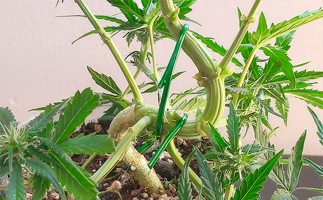 В отличие от традиционного гровинга высаживать укорененный черенок для бонсая нужно не по центру горшка, а чуть сбоку. Так будет легче гнуть и формировать будущее «деревце». Еще одна полезная хитрость – сразу вместе с черенком установить в землю толстый колышек рядом со стволом. Он будет служить дополнительной опорой и поможет зафиксировать основание стебля, чтобы не тревожить корневую систему при дальнейших изгибах веток. Для этого колышек и ствол каннабиса следует обвязать толстой бечёвкой на высоте нескольких сантиметров от уровня земли.