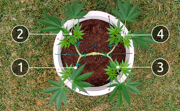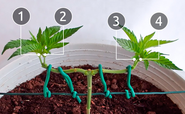 - Из оставленного узла должны исходить два новых боковых стебля. Ваша задача будет зафиксировать их под углом 90° к центральной коле. Подгибать стебли нужно аккуратно и не спеша. Не все сорта каннабиса легко переносят тренировки, какие-то ветви более хрупкие и попросту не перенесут резких движений. Даже если в процессе подгиба стебель надломился, зафиксируйте его в нужном положении, используя скотч или шнурок. Со временем он может прирасти обратно. Чтобы зафиксировать побеги, лучше использовать нетравматичный материал. Это должна быть достаточно толстая проволока в оплетке. Слишком тонкие нитки, лески или проволока могут передавить побег и препятствовать поступлению питательных веществ.