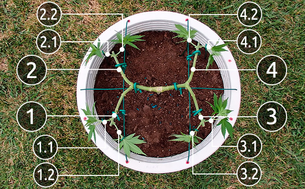 - Снова даем кусту время на выздоровление и далее повторяем аналогичные операции до тех пор, пока на нем не сформируется желаемое количество кол. Каждый раз «топая» верхушки, вы удваиваете количество побегов. Кто-то предпочитает остановиться на 16, кто-то на 32 или даже 64. Тут дело в личных предпочтениях и доступном пространстве для роста. Для многих случаев вполне хватит 8-16 кол, большее их количество не даст увеличения урожая.