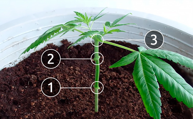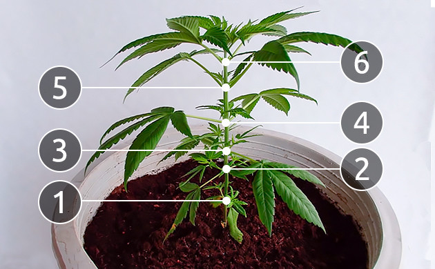 - После прорастания семян дождитесь, пока куст сформирует 5-6 узлов. Некоторые гроверы начинают растягивать коноплю чуть ли не с первых листьев, но на тот момент у нее еще нет достаточно сил и зеленой массы, чтобы быстро оправиться. Затягивать с началом тренировки тоже не стоит, ведь следующим этапом в любом случае будет обрезка. Работать лучше с молодым, но достаточно окрепшим растением. Ни в коем случае нельзя выполнять мейн лининг на цветущем кусте конопли.