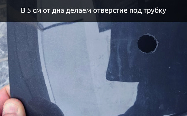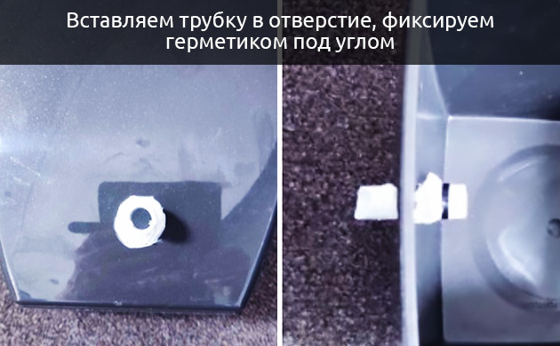- Вставляем трубку в отверстие и стараемся изнутри зафиксировать ее при помощи силиконового герметика под небольшим углом, чтобы лишняя жидкость лучше стекала из ведра.