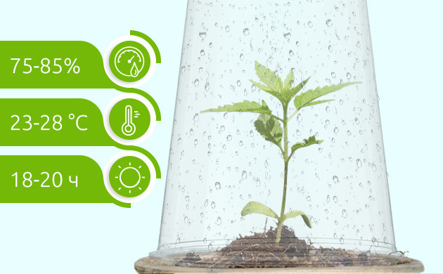 Чтобы после пересадки растение могло быстро восстановить силы и продолжить рост, ему нужны соответствующие климатические условия и уход. Потребности у конопли на протяжении жизни меняются. На стадии прорастания и рассады следует поддерживать высокую влажность, оптимальную температуру и обеспечить растениям мягкий рассеянный свет со смещением в синюю область спектра. Тогда каннабис будет быстро развиваться и за считанные недели превратится в аккуратный густой кустик.