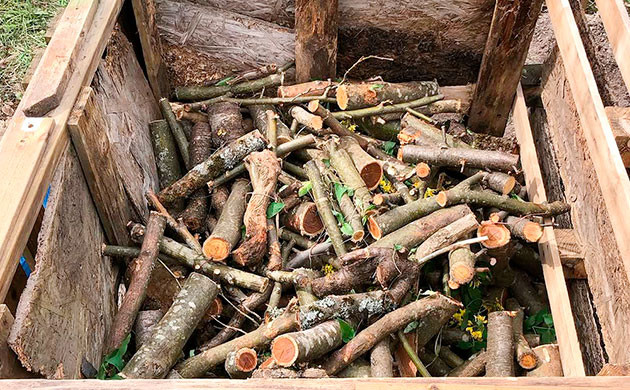 Уложите на дно углубления крупные древесные материалы. Начните с базового слоя из веток или стеблей конопли. Этот слой образует основу и будет медленно разрушаться в течение нескольких лет.