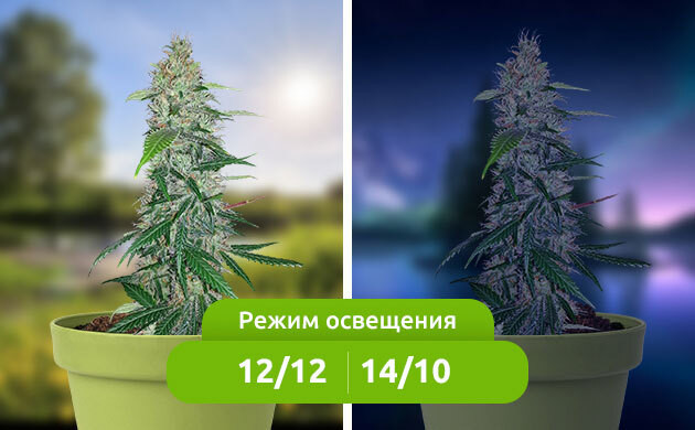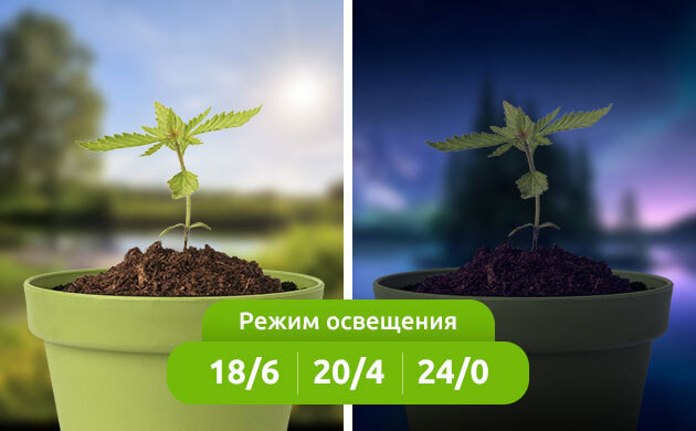 На вегетации устанавливаются режимы освещения 18/6, 20/4 или 24/0 для того, чтобы предотвратить слишком быстрое доминирование фитохромных красных рецепторов. Когда же куст уже достаточно сформирован и готов к цветению, гровер просто выбирает режим с более коротким световым днем, чаще всего это 12/12, реже 14/10. В природе большинство фотопериодных сортов конопли начинает цвести при 13-14 часах светлого времени суток. Чтобы простимулировать процесс цветения конопли, некоторые гроверы даже погружают растения в темноту на 1-2 дня.