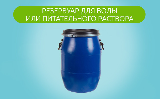 • Резервуар для воды или питательного раствора. Это может быть любая непрозрачная бочка или еврокуб желаемого размера. Еще для него нужно будет соорудить подставку либо подвесить его на стене помещения, так как он должен минимум на 1,5 метра возвышаться над уровнем трубок.